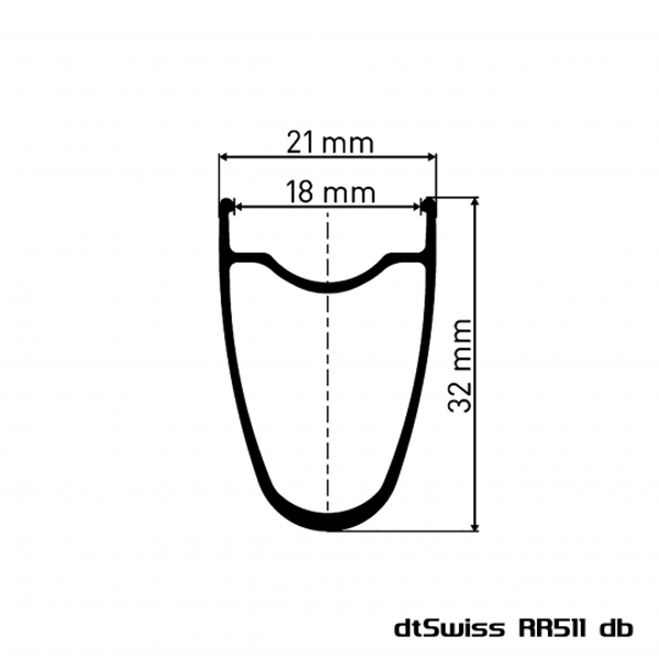 DT Swiss RR 511 db (disc brake) velg met 32 gaten. Binnenbreedte 18 mm. Buitenbreedte 21 mm. Hoogte 32 mm. Gewicht: 490 gram.